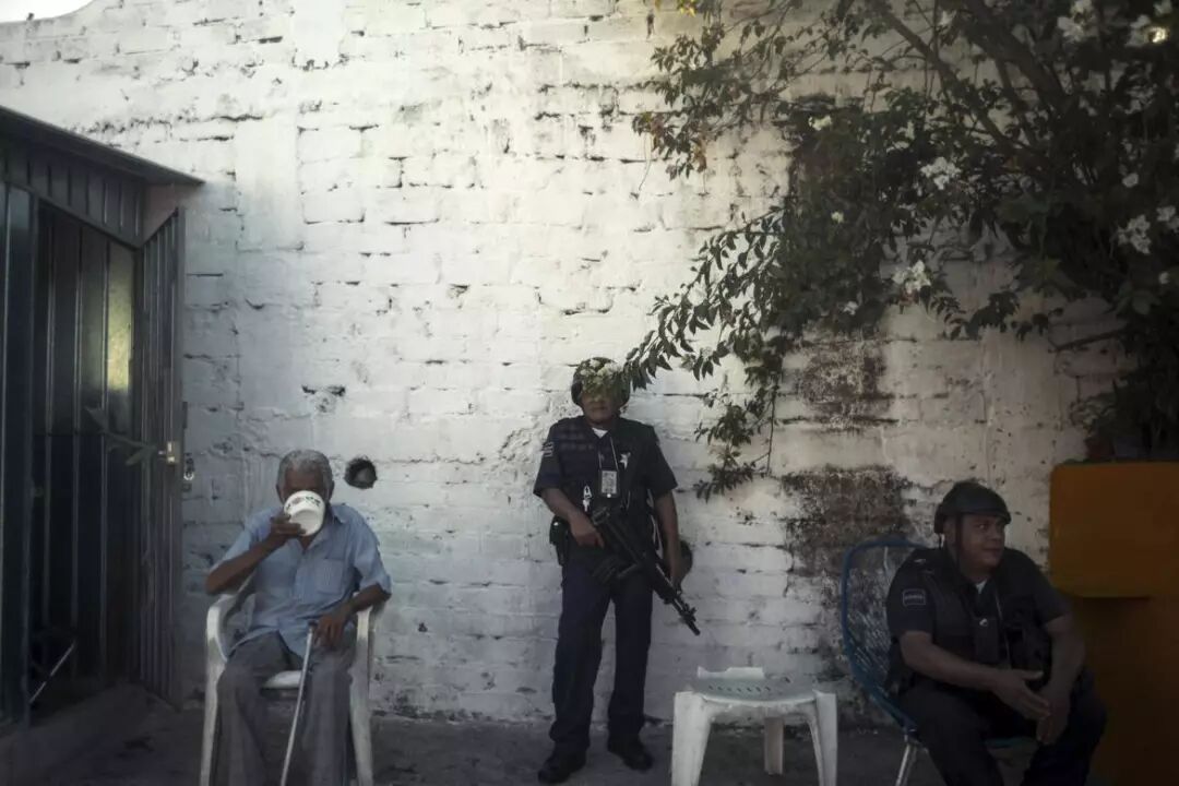 在墨西哥旷日持久的禁毒战争的核心地带——阿卡普尔科。一名平民在巷子里吃着早餐,旁边的士兵和警察守卫着一颗割下来的头颅。这颗头颅是贩毒集团成员为彼此通气而留下的信息。 相关阅读:精英蜂拥逃离,谁来拯救暴力横行的巴西? 图片来源:Marco Longari/AFP/Getty
