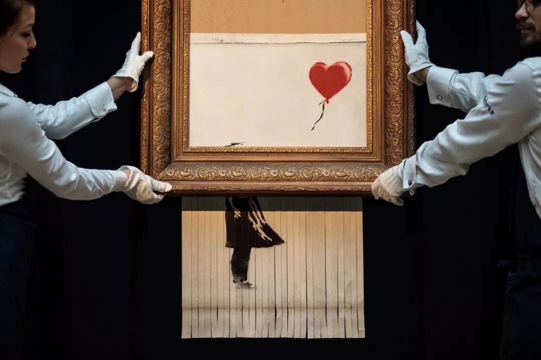 Balloon)以140万美元成交,落锤一刻,画框底部的碎纸机启动,切碎了画作的大半部分。买家同意继续这笔交易,这幅画被重新命名为《爱在垃圾箱》(Love
