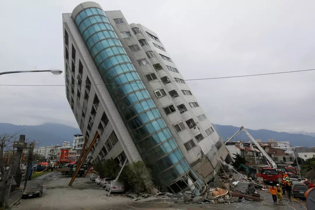 2月7日,台湾发生6.4级地震。图为震后一栋倒塌的大楼。