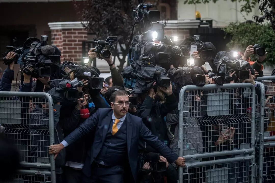 10月15日,伊斯坦布尔。在记者卡舒吉(Jamal Khashoggi)失踪事件引发的如潮谴责中,沙特调查人员先于土耳其警方抵达沙特领事馆,图为一名男子拦阻媒体人员。