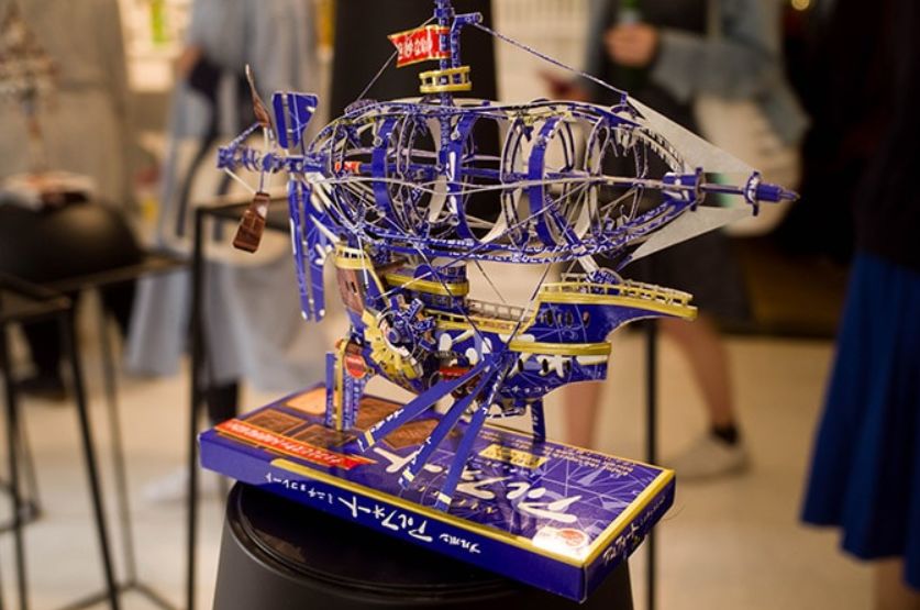 这艘飞船十分精巧, 每根缆绳细如发丝, 上面的船舱、窗户也未曾遗漏细节。 还记得吗? 它们本来都是我们平时吃零食, 随手扔掉的盒子。