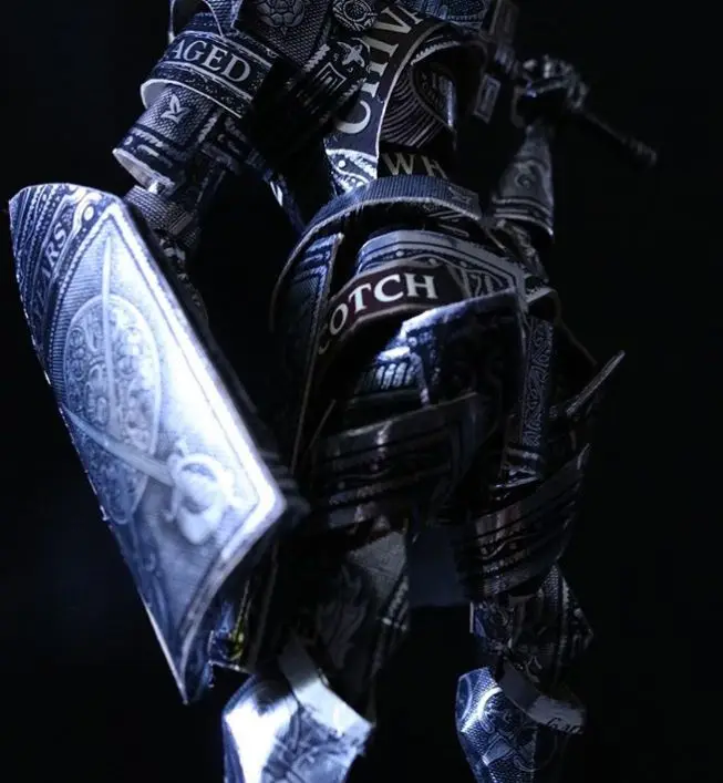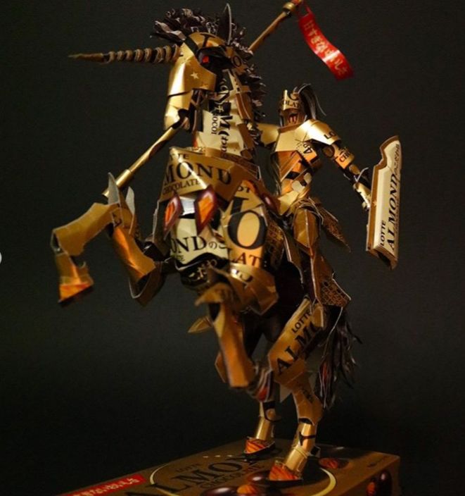 凹凸有致的盔甲纹路, 你相信是纸盒做的吗? 它不但是纸盒做的, 而且没有后期上色勾勒, 所有部分都是盒子本来的花纹。 看看这个盒子的模样就知道了。
