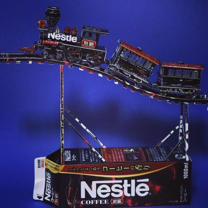 他的精细最能体现在交通工具上, 每个零部件都没有落下。 比如这辆火车, 是用雀巢咖啡的盒子做的, 从排障器到车轮间的轴承, 全部都还原了出来。