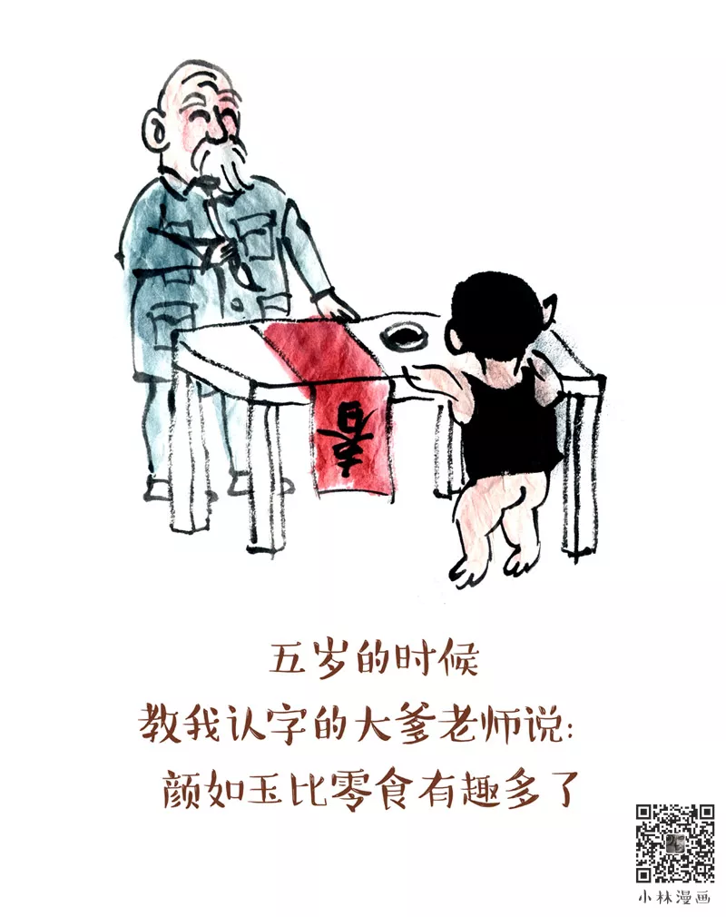 大爹是小学退休老师,脑壳光光的,走路很慢,是村里最有学问的人。 我们村是粤西最大的林姓村庄。道光年间,村里出过粤西唯一的状元林召棠,大爹就是状元公的直系后裔。 鉴于农村各种迷信,我妈觉得我应该信奉上帝(玉皇大帝,不是耶稣),于是名字里必须有个帝字,然后五行又缺水,于是必须有个水字旁,我爸想了林帝江,林帝河,林帝海均觉不满意,于是去问大爹。 大爹说,状元公最喜欢杜甫的诗,他的书斋名字就叫做“浣花溪馆”,这个浣字很少人用。 于是我就有了一个很穿越的名字,林帝浣。 后来去了成都,跑去看杜甫草堂,坐车经过浣花溪路,还是觉得很有穿越感。 杜甫很忙,居然还帮我想了个名字。 大爹是村里书法最好的人。逢年过节,都要巍颤颤的走到祠堂去,写很多对联横幅。 乡下没有幼儿园,我三四岁的时候,经常光着屁股村里乱跑,每次跑到祠堂,正在祠堂写字的大爹,就会扯住我说,“来教你个字”。 我说:“学字有什么用,我要吃糖。” 大爹说:“书中自有颜如玉。” 我说:“颜如玉有什么用,我要吃糖。” 大爹说:“你长大了就知道颜如玉比糖好多了!” 我心里说:“切~” 然后被大爹按住,学会一两个字。 直到四五岁,被大爹逮住无数次,学了不少字,经常去镇上给零食小摊表演写字,骗了不少糖和饼干橄榄来吃。 很多年之后,大爹默默地去世了。 祠堂里再也看不到,他颤抖着手写出来的端庄肃穆的正楷。 他去世之后,我接替他给祠堂写了几年春联,可是老是写不出大爹那种端庄肃穆的感觉,可能是心里都想着颜如玉了。 在祠堂写字的时候,每当有小屁孩跑过来,我就说,来学个字,小孩马上飞跑,还说“切~” 我终究是没有大爹那样的耐心。