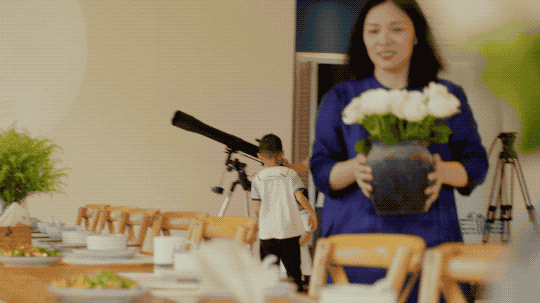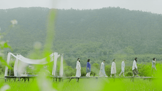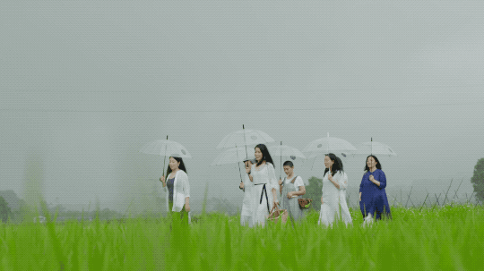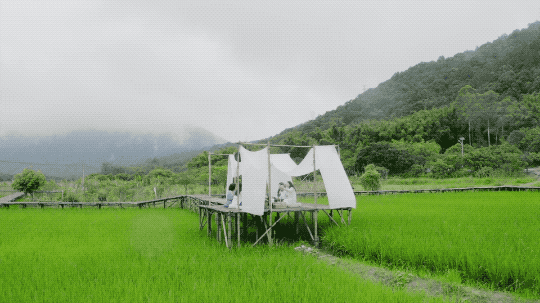7个闺蜜都非常喜欢在室外喝茶。金杜就在稻田中央做了一个茶席,再用当地的毛竹铺成一条竹子栈道,走在上面会发出嘎吱嘎吱的声音。