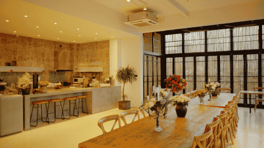 一楼的风景最好,金杜专门留作公共区域,设计成了正对稻田的乡村厨房。大家在这里,一起吃吃饭、看看书,就会很开心。