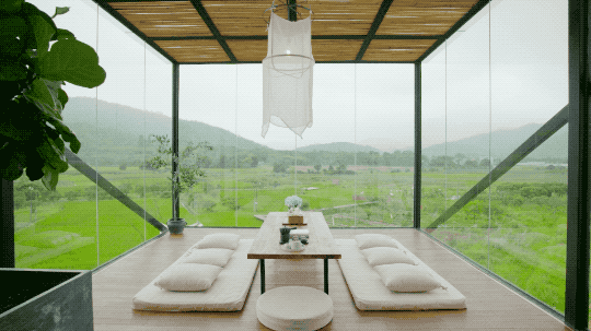 悬空玻璃房是7个好朋友最喜欢的空间。它大概有50平米,三面都是玻璃,站在中间,会觉得自己处在整片稻田的中心,很震撼。