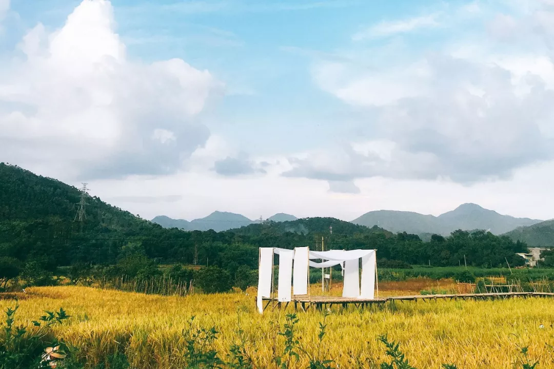 稻田中央的室外茶席、