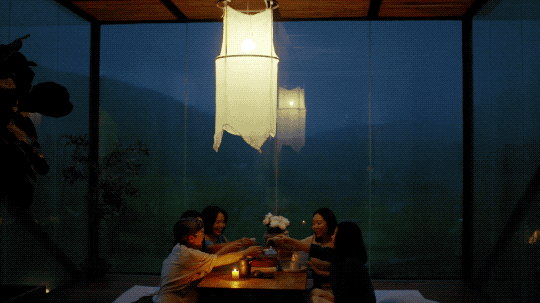 悬空玻璃房是7个好朋友最喜欢的空间。它大概有50平米,三面都是玻璃,站在中间,会觉得自己处在整片稻田的中心,很震撼。 金杜还在玻璃房中间挂了一个暖色的吊灯,很多人从村头开车进来,远远的就能看到这个玻璃屋。