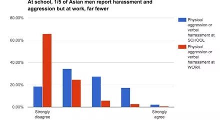在北美校园的Jock vs Nerd的鄙视链中,擅长体育的Jock才是校园的风云人物,只知道学习的Nerd亚裔男孩处在鄙视链条的最低端,常常会被嘲讽或欺负。 从这份来自2015年《亚裔美国男性研究》的统计,可以看到将近20%的亚裔男孩在学校遭受欺凌。