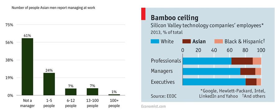 右图来自经济学家网站,在Google等五所公司中,亚裔是各个族裔中提拔到高管层的比例最低的。