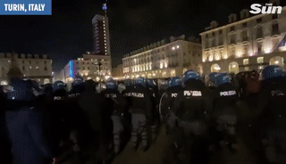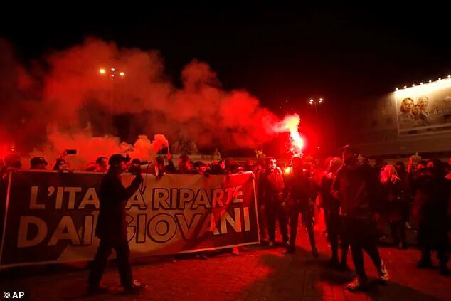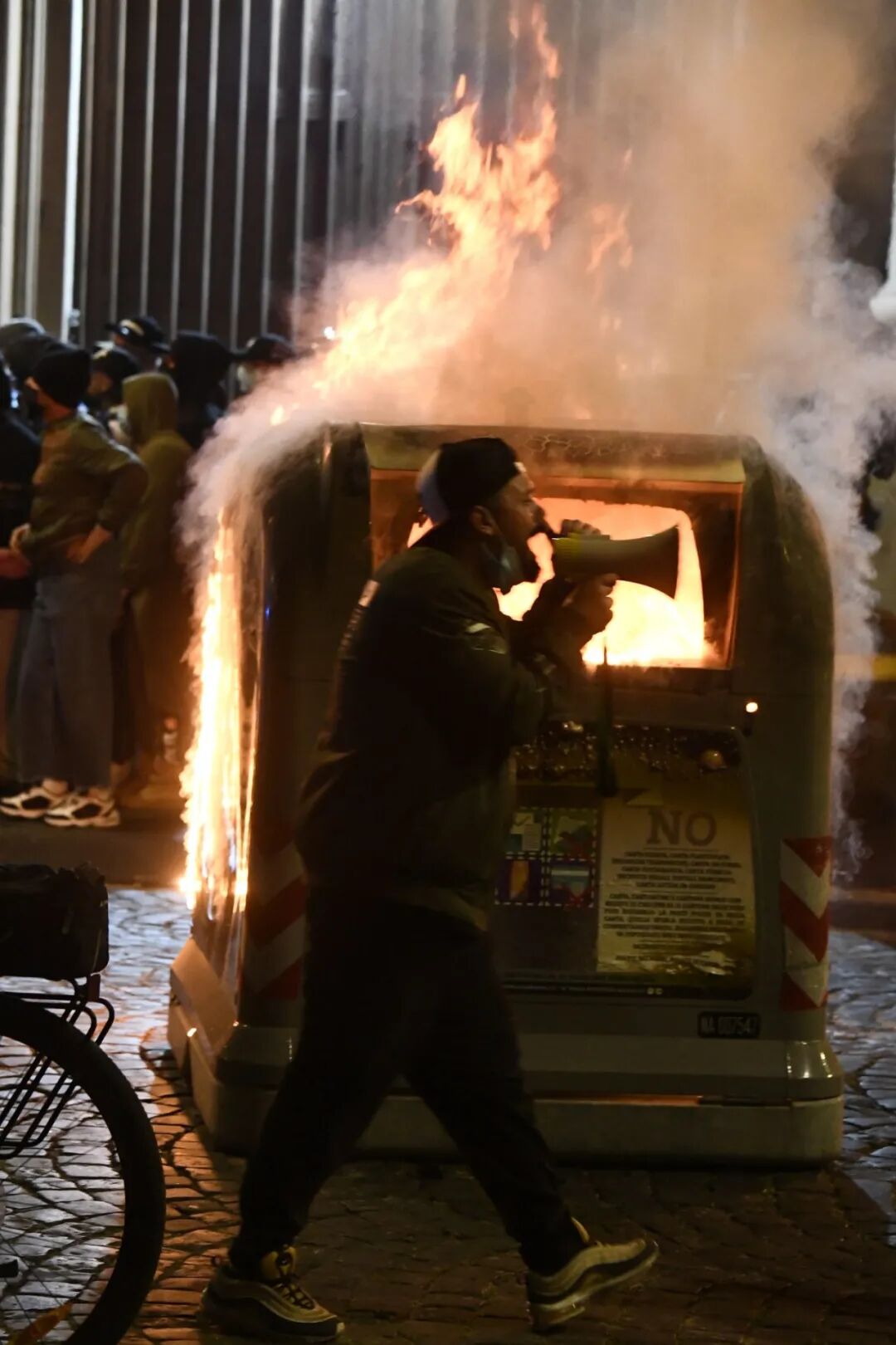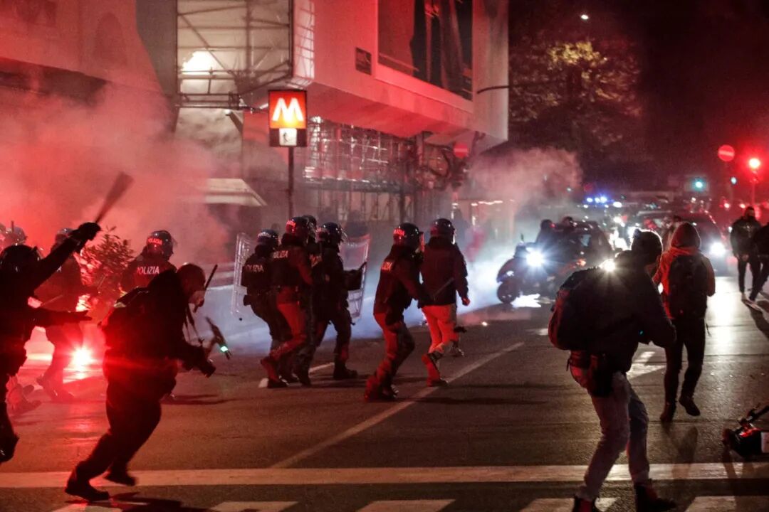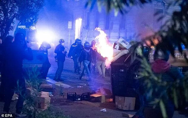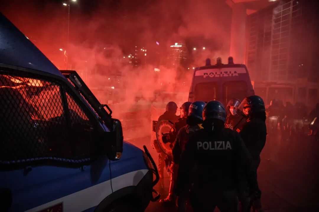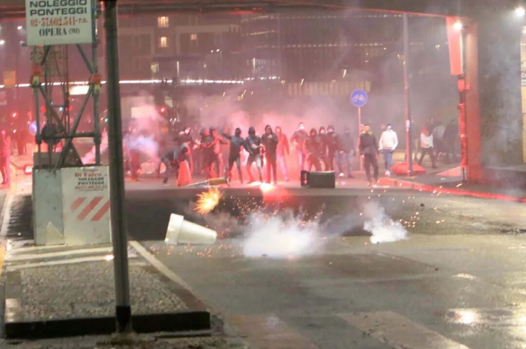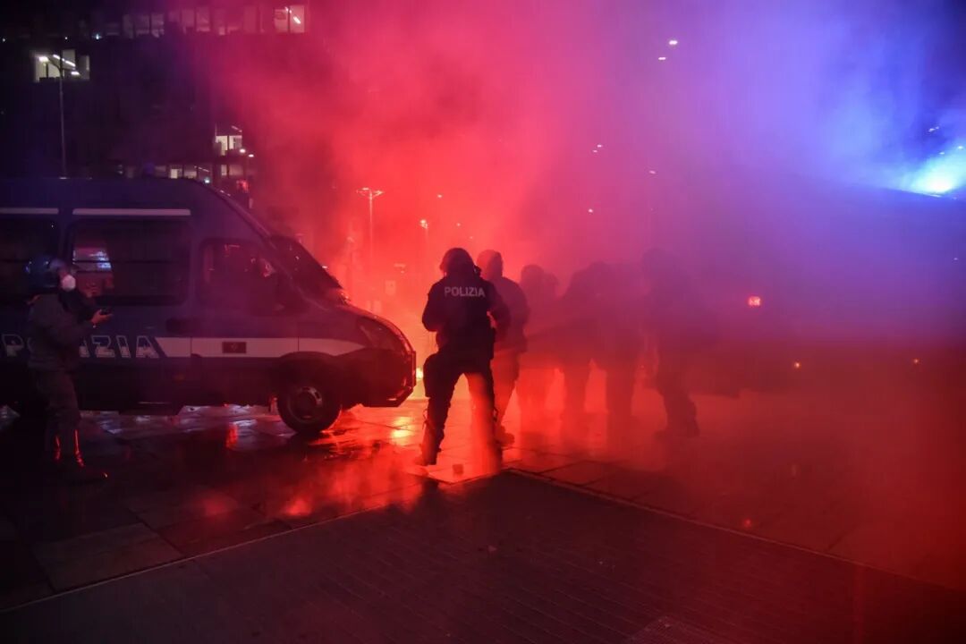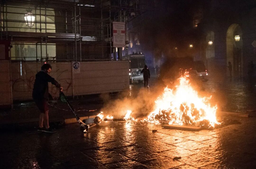 隔壁城市米兰,抗议者们高喊“自由、自由、自由”,往市中心投掷一枚又一枚的汽油弹,大火点燃时尚之都的黑夜。多名警察在这场暴乱中受伤。