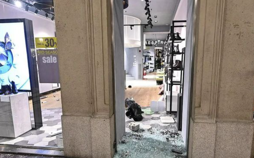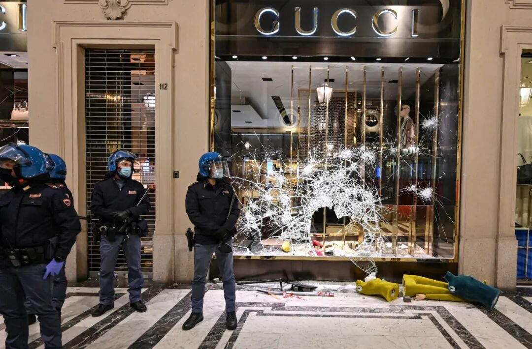 暴乱在意大利罗马、都灵、米兰等12个城市进行。 在都灵,穿着黑衣服戴着面罩的暴徒们涌上街头和商场,朝着警察投掷烟雾弹和玻璃瓶,并到处放火,砸破Gucci等一些奢侈品店的玻璃门窗,把衣裤从模特身上扒拉下来,抢了就跑。