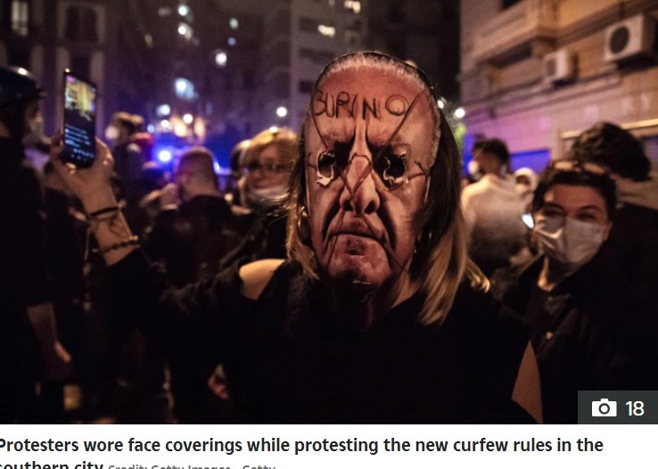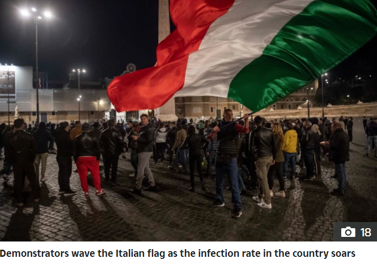 而这些愤怒仅仅来自前一夜,意大利政府发布新禁令,民众在户外必须戴口罩,餐厅和咖啡馆傍晚就得关门,电影院、健身房、剧院等暂停营业,滑雪场禁止开放等防疫政策。