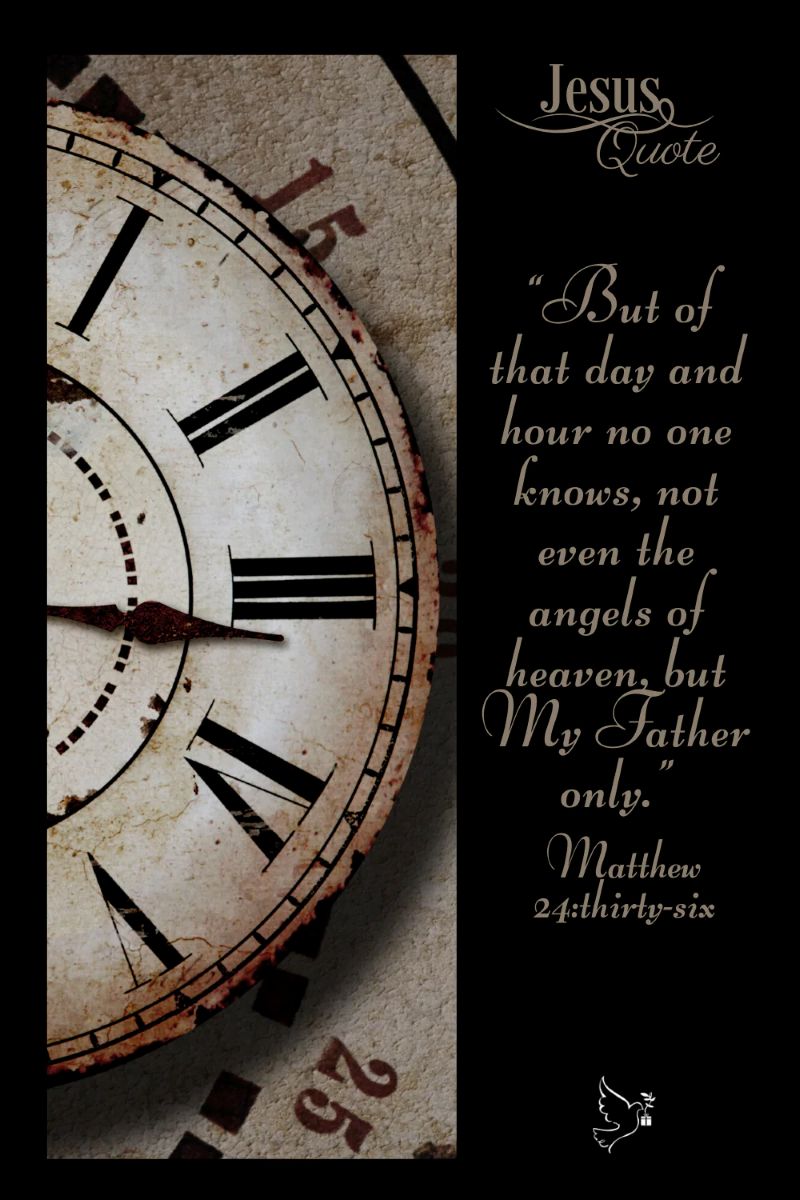 马太福音24:36说了一段很长的经文:“那日子,那时辰,没有人知道,连天上的使者也不知道,子也不知道,唯独父知道。”接着,主耶稣举了挪亚的例子。第39节说:“不知不觉洪水来了,把他们全都冲去;人子降临也要这样。”这是我们熟悉的经文。