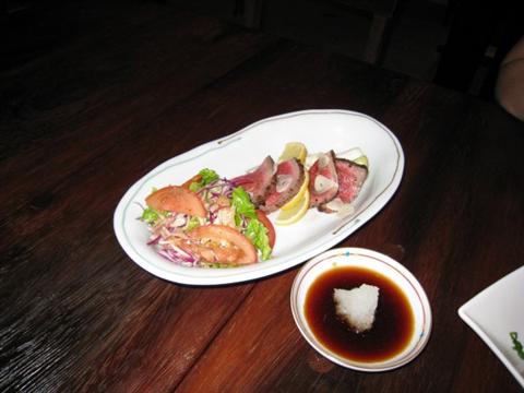 一声一大大吉马嘶(日语的意思)!一下子就将沉醉在日本规矩里的俺跟阿福唤回来了。接着“喜来牙马”的母亲用一个盘子端了几样菜上来。俺赶紧站起来向他母亲行了个九十度的大礼!害的阿福不好意思,也站起来鞠了一个躬,当然没有俺标准。由于屋内的空间不大,又摆了桌子,这会儿“喜来牙马”的母亲放下子后回礼时就施展不开了,只是微微将屁股抬高,弯了个腰而已。“喜来牙马”及他的母亲对俺的“大礼”十分受用,直说您们中国是礼仪之邦的大国,到底是不一样。俺也放下了忐忑不安的心!